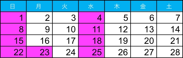 | 月 | 火 | 水 | 木 | 金 | 土 | 日 | 祝 |